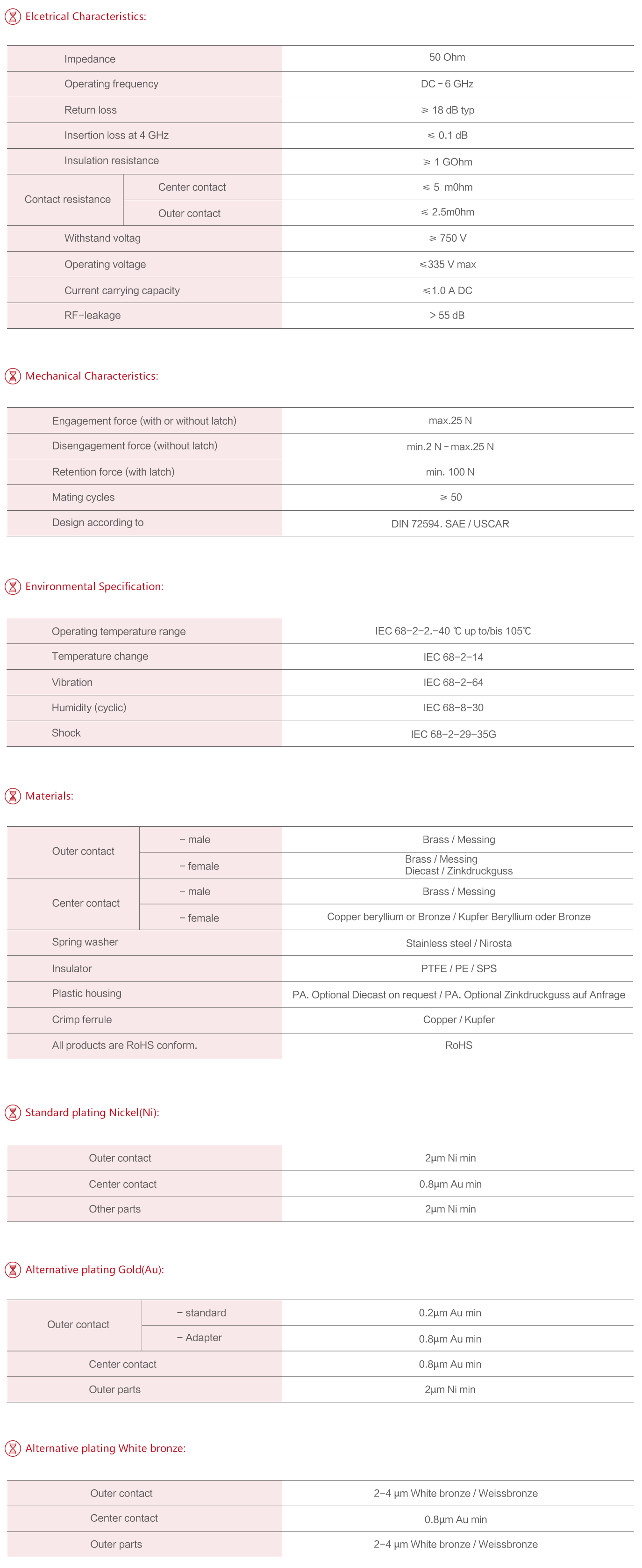 電器性能阻抗50Ω或75Ω,頻率范圍DC-6GHZ,駐波比1.4 MAX(DC-2GHZ), 1.5MAX(2GHZ-3GHZ), 1.6MAX(3GHZ-6GHZ)。
